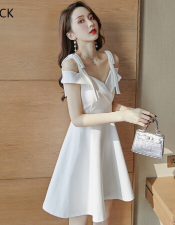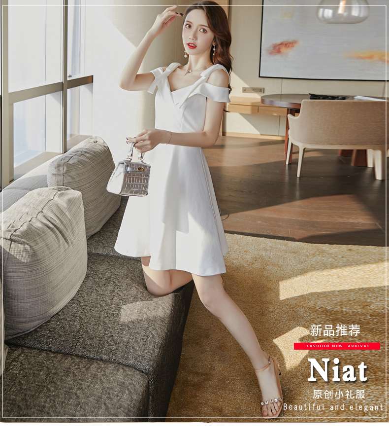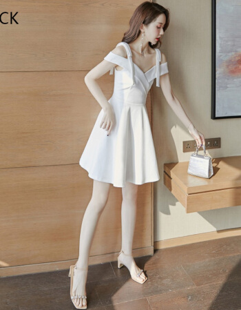 • KM CK 宴会气质平时可穿显瘦吊带一字肩连衣裙白色小晚礼服裙